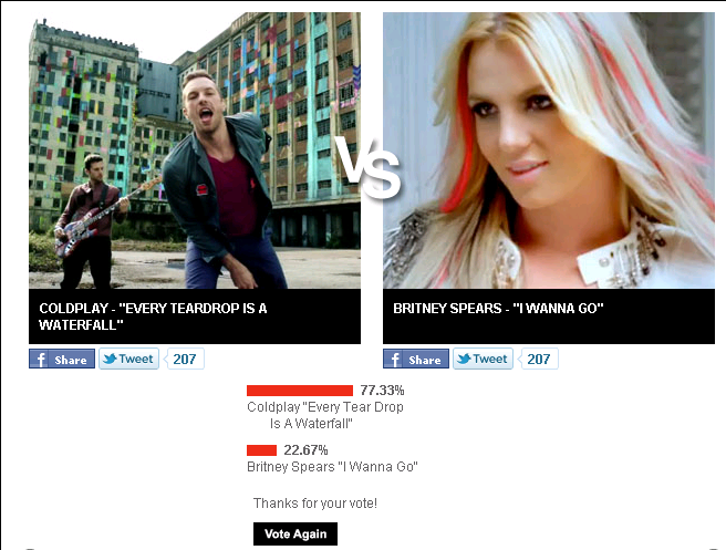 After beating Ke$ha & Kelly Clarkson, Britney turns around to 3rd competition versus Coldplay, keep VOTE my armies, coz Britney was far close behind Coldplay!