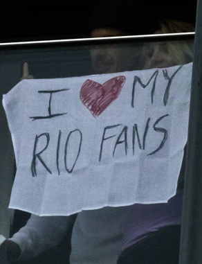 home-made sign with Jason, that read: 'I love my Rio fans,' written in