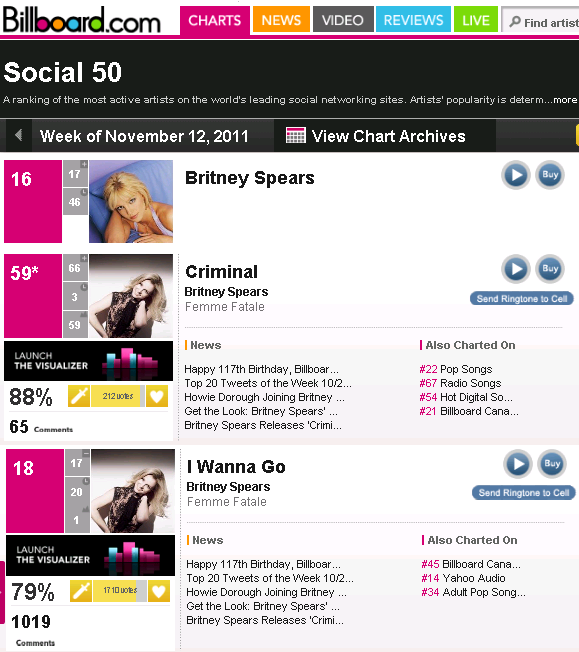 Britney Spears has a very low time this week, after Femme Fatale UK Tour has been criticized, this week Britney Spears singles "I Wanna Go", "Femme Fatale" album & "B In The Mix Vol. 2" has gone away from Billboard charts, thats made us mad, keep purchase please!